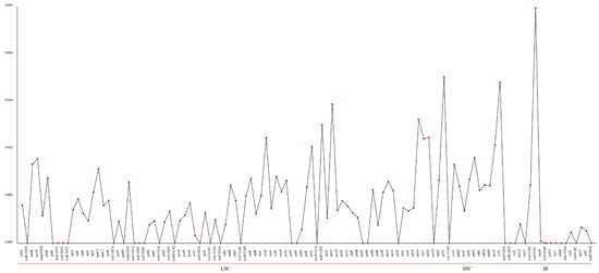 The nucleotide diversity (pi) values of the selected eight cpDNAs, calculated within the slide window, ranged from 0 to 0.02976, with an average of 0.00471 (Figure 7). According to the data, three regions were highly variable, IR.trnI-GAU, SSC.rpl32 and SSC.ycf1, with pi values higher than 0.02. The results showed low pi values, which suggests the cpDNA sequences are highly conserved at the sequence level throughout the genus.