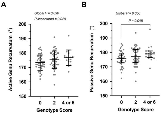 The (A) mean ± standard deviation of the active and (B) median (IQRs) of the passive genu recurvatum of the α1(V) (COL5A1), α1(XI) (COL11A1) and α2(XI) (COLL12A1) collagen genotype scores. Participants received a genotype score of 2 for each COL5A1 rs12722 CC, COL11A1 rs3753841 CC, COL11A1 rs1676486 TT and COL12A1 rs1799907 AA genotypes and 0 for all other genotypes, so that the genotype scores ranged from 0 to 8. None of the participants had a genotype score of 8 and the genotype scores of 4 and 6 were combined for the analysis. The individual values are shown as solid grey circles. The global test for linear trend and the Dunn’s multiple comparisons test p values are indicated. Lower degree values for genu recurvatum indicates a greater amount of knee hyperextension.