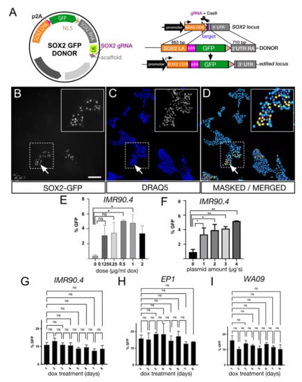 Doxycycline inducible gene targeting at the SOX2 locus. (A) A diagram illustrating the design of a hybrid SOX2-GFP donor vector that carries a targeting cassette for the endogenous SOX2 gene and a U6 promoter driving a SOX2 specific guide RNA (left) and an overview of the editing strategy at the SOX2 locus (right). Imaging of SOX2-GFP integrated cells visualized by (B) GFP fluorescence and (C) DRAQ5 nuclear counterstain fluorescence at 5 days post-transfection. (D) GFP+ cells (yellow; arrows) and DRAQ5 labeled nuclei (blue) were identified by automated segmentation and mask generation used for cell counting. (E) SOX2-GFP integration efficiency in IMR90.4-HF-iCas9 cells after increasing doses of dox, or (F) increasing doses of plasmid for transfection. (G) IMR90.4-HF-iCas9, (H) EP1.1-HF-iCas9 and (I) WA09-HF-iCas9 PSCs following a time course treatment with dox. Each sample was calculated from 25 fields (n > 3 biological replicates) of view with error bars represented as standard error of the mean (SEM). One-way ANOVA was used to test statistical significance and for multiple comparison tests, a Dunnett’s multiple comparison procedure was used with an α cutoff of 0.05. * p < 0.05, ** p < 0.01, ns = not significant. Scale bar (B–D) = 200 µm.