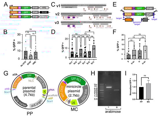 Donor plasmid optimization for gene-editing by homology-directed repair. (A) Different DNA tagging sequences (DTS) were inserted into the SOX2-GFP donor plasmids. (B) The role of SV40 and HRE DTS sequences on SOX2-GFP integration was assessed by measuring the number of GFP+ cells relative to DAPI+ total cells. (C) Three different guide RNA scaffolds based on Ran et al. (2013) [4] (V1), Dang et al. (2015) [33] (V2) and Chen et al. (2013) [34] (V3) illustrate the variation in the first stem-loop structure that interacts with Cas9. (D) Quantification of GFP+ cells after editing with SOX2-GFP donor plasmids harboring HRE and SV40 DTSs and the V1-3 scaffolds. (E) Illustration of SOX2-GFP donor fragment double cutter (dc) linearization by the introduction of SOX2 targeting sites at the distal ends of the homology arms. (F) Quantification of the effect of donor fragment linearization on integration in the presence of SV40 or HRE DTS fragments. (G) Illustration of a standard parental plasmid (PP) and a minicircle plasmid (MC) with bacterial sequence elements removed. (H) Agarose gel electrophoresis of Kpn1 digested PP and MC plasmids in the absence (−) or presence (+) of arabinose. (I) Comparison between PP and MC plasmids for SOX2-GFP integration. One-way ANOVA was used to test statistical significance and for multiple comparison tests, a Dunnett’s multiple comparison was used with an α cutoff of 0.05. * p < 0.05, ns = not significant.