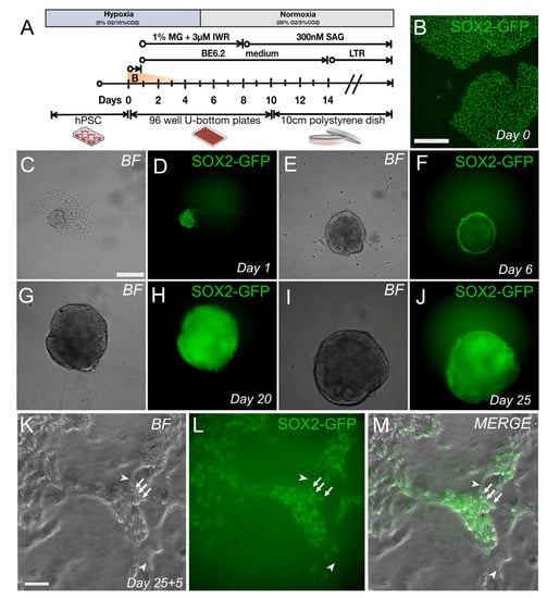 To validate that gene-edited PSCs still retained their ability to form neurons, we carried out 3D organoids differentiation as previously described [22,28] (Figure 4A). IMR90.4 iPSCs with SOX2-GFP expression (Figure 4B) maintained their fluorescence during differentiation up to day 25 (Figure 4C–J). Since it is sometimes difficult to assess fluorescent signals deep within organoids, we dissociated day 25 organoids and cultured them as monolayers on Matrigel-coated TC plates (Figure 4K–M). After 5 more days most neurons had retained their SOX2-GFP expression (arrows), however, some had not (arrowheads). This was expected since SOX2 is known to be expressed in stem cells and neural progenitors, but not in mature cells, other than Müller glia [38]. This data showed that gene-edited HF-iCas9 cells retained their ability to differentiate into early-stage neurons.