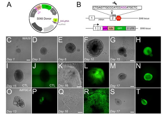 Targeting of the SIX6 gene in multiple genetic backgrounds and differentiation into 3D organoids. (A) A SIX6 hybrid donor vector with homology arms flanking the SIX6 stop codon and a U6 promoter for guide RNA targeting. (B) A schematic of SIX6-GFP integration at the SIX6 stop codon. (C–G) Brightfield images from days 1–15 organoids in WA09-HF-iCas9 SIX6-GFP ESCs with (H) fluorescence detected on day 15. (I,J) SIX6-GFP negative control organoids from WA09-HF-iCas9 SIX6-GFP ESCs in brightfield and GFP fluorescence. (K,L) WA09-HF-iCas9 SIX6-GFP organoids derived with an alternative protocol grown as a monolayer and (M,N) lifted into suspension. (O,P) IMR90-HF-iCas9 SIX6-GFP organoids under brightfield and fluorescence at day 13 or using an alternative protocol in (Q,R) adherent culture or (S,T) lifted into suspension. Scale bars (C–F,M–P,S–T) = 200 µm; (G–J) = 400 µm; (K–L,Q–R) = 150 µm.