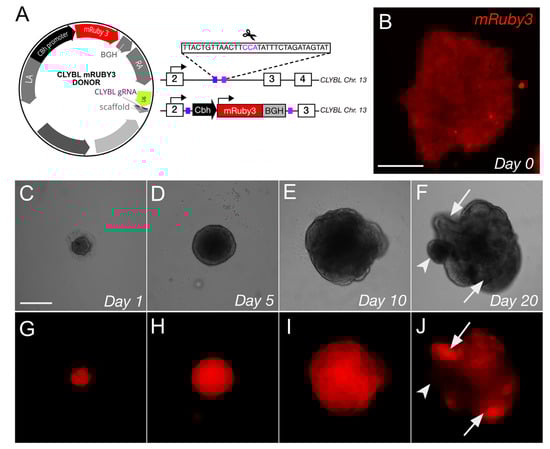 Safe harbor sites (SHS) have been utilized for the stable integration of genetic cargo in human cells; however, many studies are limited to the AAVS1 locus. Other sites (e.g., human ROSA locus, H11 and CLYBL) have also been identified but only studied superficially in immortalized cell lines or in PSCs [13,14]. To address this, we used our all-in-one plasmid to test whether the Citrate lyase β-like (CLYBL) site could sustain reporter expression in HF-iCas9 stem cells and differentiating neurons. Cells were dox induced and transfected with a CLYBL-Cbh-mRuby3 (CLYBL-mRuby3) targeting plasmid (Figure 6A) into IMR90.4-HF-iCas9 cells where we observed mRuby3 expression within 24 h. One week later, when transgenes were stably integrated, mRuby3 constitutive expression was evenly distributed in cells that had taken up the transgene. We utilized the presence of mRuby3+ hPSC colonies as a proxy for integration of the transgene cassette instead of Sanger sequencing PCR amplicons. To ensure mRuby3 homogeneity in cells, we clonally passaged PSCs and saw that mRuby3 was qualitatively similar in brightness throughout all clones (Figure 6B). After repeated passage, a loss of fluorescence was occasionally observed in mRuby3+ clones, indicating gene silencing (not shown). To explore whether constitutive mRuby3 PSC reporters maintained expression after differentiation, we differentiated cells into retinal organoids (Figure 6C–J) and observed that CLYBL-mRuby3 PSCs formed stereotypical optic vesicle organoids (Figure 6C–F) that maintained their red fluorescence at early stages (Figure 6G–J, arrows). Not surprisingly, by day 20 some mRuby3 negative pockets had emerged that indicated potential transgene silencing (Figure 6J; arrowhead). Overall, our system works well for CLYBL SHS targeting, however, further work is needed to address potential transgene silencing in different tissue systems.
