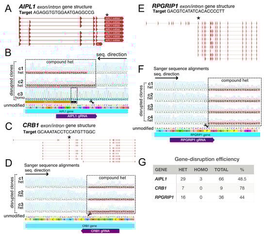 For gene knockout, AIPL1, CRB1 and RPGRIP1 guides were designed as described above. Guide RNA sequences were inserted by site-directed mutagenesis into the hybrid donor with no homology arms.