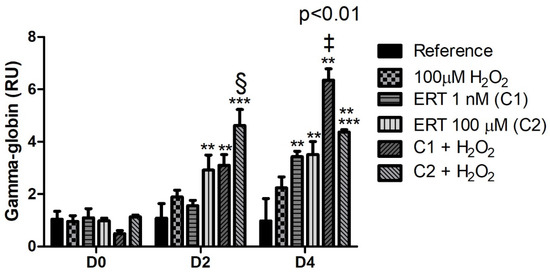 The comparisons of the relative gene expression of mRNA γ-globin (Figure 2) showed an increased expression during the erythroid differentiation process (days 2 and 4), with higher transcript levels (up to ~6.5-fold increase) at the end of the process (D4). Additionally, it is interesting to notice that almost all ERT treatments, regardless of hydrogen peroxide administration, showed higher mRNA levels than their respective controls during the erythroid differentiation process. Such observations suggest that ERT may influence this gene expression.