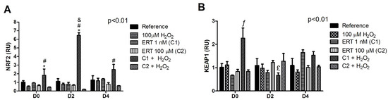 The comparisons of the relative gene expression of the Keap1/Nrf2/ARE signaling pathway showed a 6.5-fold increase of Nrf2 levels in C1 + H2O2 (Figure 3A). Furthermore, a peak of mRNA expression of Keap1 (~2-fold increase) can be observed in C1 + H2O2 on D0 (Figure 3B). These results reveal an intriguing effect of the treatment (C1 + H2O2) within the differentiation periods; the effect of the lower concentration of ERT (C1) compared to the highest (C2), both associated with the addition of H2O2 within each evaluated period. In addition, in the same treatment (C1 + H2O2), there is a significant reduction (~1.5-fold) in the transcript levels of Keap1 at the beginning of the differentiation process (D2) in relation to the same treatment in D0. A similar pattern (although not statistically significant) can be observed on day 4. Such observations reinforce the cytoprotective effect of ERT when cells are in the presence of H2O2, suggesting a conditioned action of ERT.
