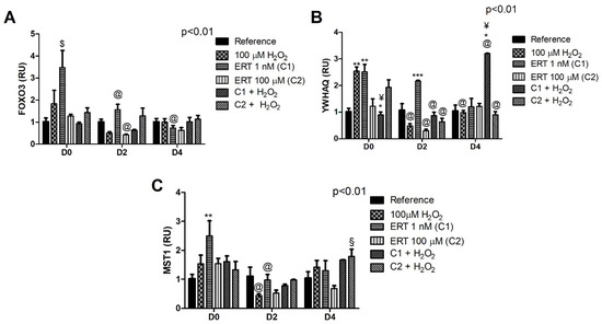 In relation to the YWHAQ gene (Figure 4B), C1 + 100 µM H2O2 seems to induce the expression during the cell differentiation process, while the opposite behavior is observed for C2 + 100 µM H2O2. Additionally, a ~2.5-fold increase of gene expression was observed in the Peroxide and ERT C1 treatments (D0) when compared to the reference, demonstrating an effect of these treatments that is no longer observed in the other evaluated periods. Finally, when observing the expression of the MST1 kinase gene (Figure 4C), a decrease in the expression of this kinase was observed in the peroxide and ERT C1 treatments (D2). These expression profiles allude to MST1-FoxO3 pathway activation (increase in FOXO3 and MST1, concomitantly with a decrease in 14-3-3), which suggests a possible cytoprotective effect of ERT for the ERT C2 + H2O2 treatment.
