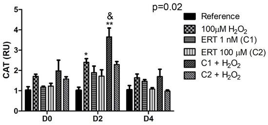 The comparisons of the relative gene expression of mRNA CAT (Figure 6) showed, on day 2, a ~2.5-fold increase of the Peroxide treatment (compared to the reference) and a ~3.5-fold increase in expression in the ERT C1 + 100 µM H2O2 treatment, in comparison with the treatments Reference (pattern also observed in D0) and ERT C2 + 100 µM H2O2, demonstrating an effect of ERT dependent on the addition of peroxide (100 µM H2O2).