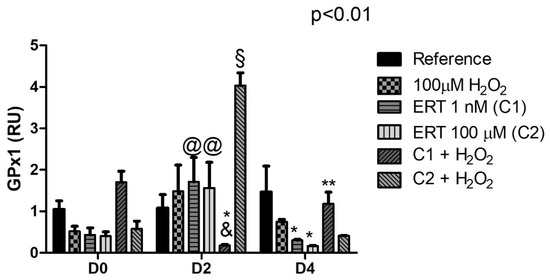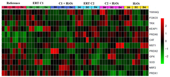 Peroxide treatment showed a ~3- and a 2-fold decrease in expression of TRX (days 2 and 4, respectively), while ERT C1 treatment exhibited an increased expression (~3.5-fold on days 0 and 2). Although not significant, a pattern of reduction prevention (day 2) can be observed when analyzing the relative expression of the treatments C1 + 100 µM H2O2 and C2 + 100 µM H2O2 (Figure 8).