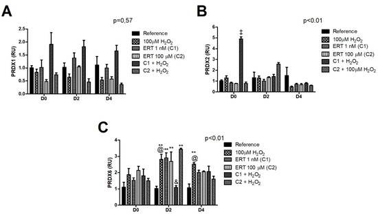The comparisons of the relative gene expression of the transcript PRDX1 (Figure 9A) did not show statistically significant variations between treatments or periods of differentiation. Despite this, an antagonistic expression pattern can be observed according to the concentration of ERT administered in association with peroxide, in which C1 induces, and C2 inhibits PRDX1 expression, especially on days 2 and 4. PRDX2 (Figure 9B) showed a constant expression in all treatments during the observed periods, except for ERT C1 + 100 µM H2O2 treatment (day 0), in which there is a ~5-fold increase in gene expression. Although not significant, the same pattern can be observed, on day 2, for the ERT C2 + 100 µM H2O2 treatment. On day 2 of PRDX6 gene expression (Figure 9C), an increased level of transcripts (up to ~3.5-fold) in the treatments Peroxide, ERT C1, ERT C2, and ERT C2 + 100 µM H2O2 was observed. Furthermore, in the same period, a decreased expression in ERT C1 can be observed, with the physiological concentration being restored.