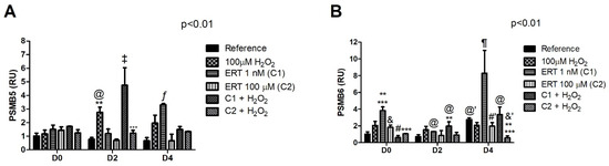 The comparisons of the relative gene expression of PSMB5 (Figure 10A) showed a constant expression in all treatments during D0. Although, during the beginning of the erythroid differentiation process (D2), a ~2.5- and 4.5-fold increased expression can be observed in the Peroxide and ERT C1 + 100 µM H2O2 treatments, respectively. However, at the end of the differentiation process (D4), the expression returns to a constant state in all treatments associated with H2O2, even though a seemed elevated expression can be observed in the Peroxide treatment. All treatments with ERT associated with the oxidation induction, regardless of the period of differentiation, present expression levels equivalent to the physiological concentration, except for the ERT C1 + 100 µM H2O2 treatment in D2. Regarding PSMB6 expression (Figure 10B), on D0 and D4, a decreased pattern of expression can be seen in the treatments ERT C1 + 100 µM H2O2 and C2 + 100 µM H2O2 when compared with the Peroxide, ERT C1, and C2, respectively. Lastly, on the D4, higher transcripts levels of both PSMB5 and 6 (~3- and 8-fold increase, respectively) in the treatment ERT C1 can be observed.