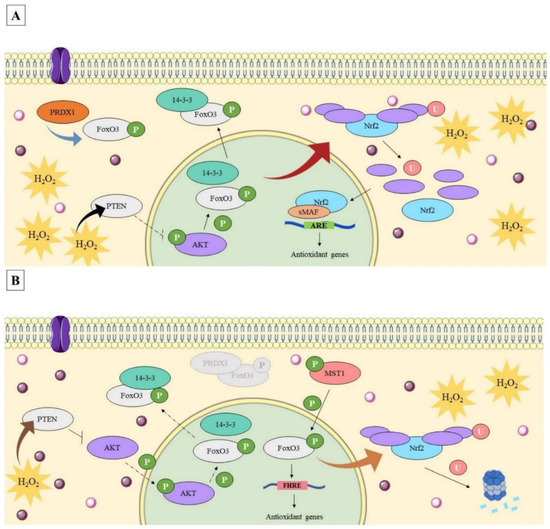In contrast, FoxO3 (Forkhead box class O3) has its activity regulated mainly through post-translational modifications in response to external stimuli. Under the stimulus of growth factor, for example, this transcription factor is negatively regulated through phosphorylation via the PI3K/AKT (phoinositide 3-kinase/protein kinase B) signaling pathway (translocation mediated by chaperone 14-3-3, human gene symbol YWHAQ), thus preventing the transcription of its target genes [19,20,21]. When under oxidative stress, the MST1 (mammalian sterile 20-like 1) kinase phosphorylates the cytoplasmic FoxO3 (blocking the interaction with 14-3-3), promoting its nuclear translocation. Thus, through the transcription of its target genes, FoxO3 controls whether the cell enters the path of survival (by inducing antioxidants genes, such as SOD1 and 2, CAT, GPX1, TRX1, and PRDX1, 2, 3, and 5) or apoptosis (pro-apoptotic and CDK inhibitors genes), in an intensity-dependent manner [19,20,21].