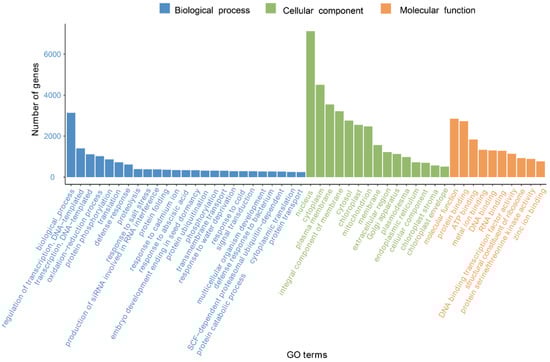 In the GO database, there are three systematically defined ways of describing the functions of gene products, namely the molecular function, biological process, and cellular component. As shown in Figure 2, a total of 27,111 unigenes were classified by GO annotation and divided into fifty functional groups in three categories. Among all categories, the nucleus category in the category of cellular components was the most annotated, accounting for 29.6% of the total annotations, followed by the cytoplasm (16.3%), and biological process categories (13.1%).