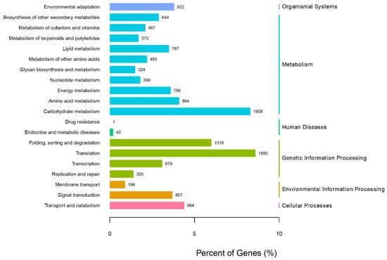 In order to further analyze the function of unigenes in the transcriptome of G. macrophylla, the eggNOG functional classification analysis was performed. As shown in Figure 3, a total of 23 different eggNOG functional groups were obtained, including most life activities. The number of genes predicted by general functions was the largest, with 3389 unigenes; 17,167 unigenes were annotated in the KEGG database, involving a total of six major branches of the KEGG metabolic pathway (Figure 4). The top three annotated subcategories were translation, carbohydrate metabolism, and folding sorting and degradation, accounting for 7.82%, 7.68%, and 5.94% of the total annotations in the database, respectively.