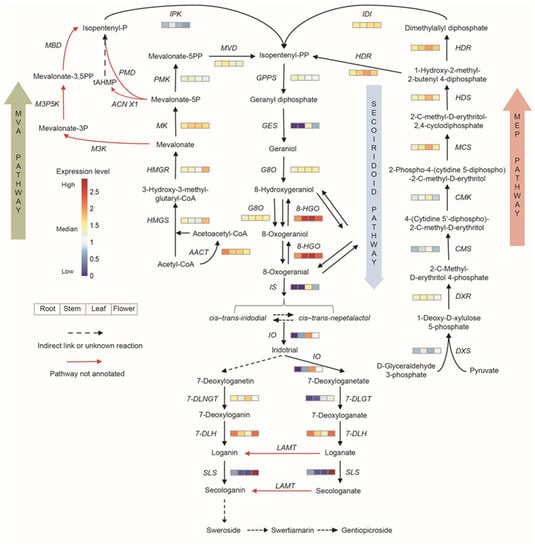 As special terpenoids, iridoids also have similar synthetic pathways and are synthesized from geranyl pyrophosphate via complex ring opening, rearrangement, cyclization, and glycosylation processes. In total, 102 unigenes were annotated to 25 enzymes involved in iridoid synthesis pathways. The expression of enzyme genes in the biosynthetic pathways of iridoids is shown in Figure 5. Most of the genes showed higher expression in leaves and flowers.