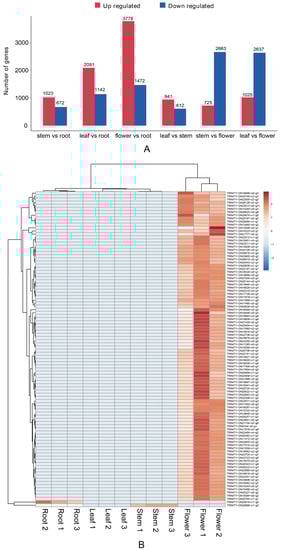 Expression of differential unigenes in G. macrophylla: (A) A summary upregulated and downregulated unigenes between sets of two specified samples. (B) Heatmap of differentially expressed genes from different tissues. Each column in the figure represents one sample, while each row represents one gene. The colors indicate the normalized gene expression levels (log10 (TPM+1)) in different tissues. Red and blue represent high and low expression levels, respectively.