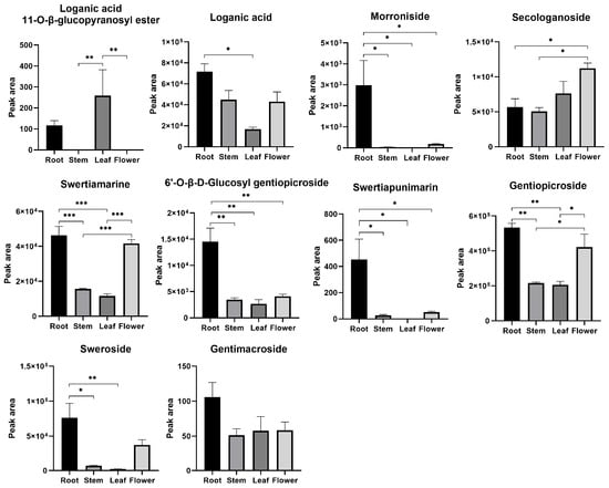 A loganic acid 11-O-β-glucopyranosyl ester was not identified in stems or flowers. Morroniside and swertiapunimarin were not detected in the leaves. Most of the iridoids were abundant in roots (Figure 10).