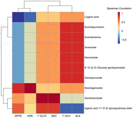 Cluster analysis of the expression of six key enzyme genes (HDR, GPPS, G8O, SLS, 7-DLGT, and 7-DLH) related to the contents of ten iridoids. Red and blue represent positive and negative correlations, respectively.
