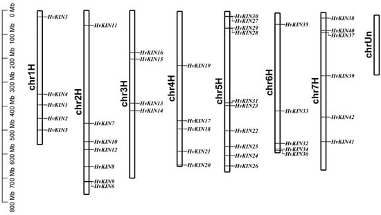 As we can see from the results of gene distribution, HvKIN genes are localized on seven chromosomes and show an uneven distribution. Among them, 10 of these HvKIN genes are located on chromosome five, chromosome three is the least distributed, with only four genes, and the other chromosomes have 5–7 kinesin genes distributed on them (Figure 2).