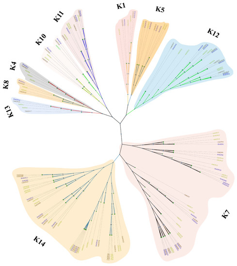To investigate the evolutionary history and functional associations of kinesin family proteins, a maximum likelihood phylogenetic tree was constructed by MEGA X (https://www.megasoftware.net/ accessed on 9 October 2021), using the full-length amino acid sequence of KINs from 42 members in barley, 48 members in rice and 61 members in Arabidopsis (Figure 3).