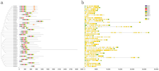 HvKINs structure and conserved motif distribution analysis. (a). The barley HvKIN proteins’ motif composition. The motifs, which are shown in variously colored boxes, were identified by MEME 5.0.1 in the HvKIN proteins. (b) The yellow and green bars represent the CDS and the untranslated region (UTR), respectively, while the black line represents the intron.