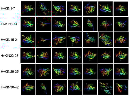 According to the protein 3D structure prediction website (phyre2, http://www.sbg.bio.ic.ac.uk/~phyre2/html/page.cgi?id=index accessed on 9 March 2022), forty-two HvKIN proteins have a complex protein secondary structure and are mainly composed of α helix and Random coil (Figure 7). The percentage of α helix in the family ranges from 27.14% (HvKIN42) to 73.09% (HvKIN22), and the percentage of Random coil ranges from 17.31% (HvKIN28) to 52.56% (HvKIN14) (Figure 7). In addition, β-turn (β turn) and extended strand (Extended strand) are included, with β-turn ranging from 1.96% (HvKIN27) to 7.62% (HvKIN42) and extended strand ranging from 5.97% (HvKIN22) to 26.67% (HvKIN42) of the members. This indicates that the family proteins are mainly composed of α-helices and irregular coils.
