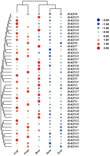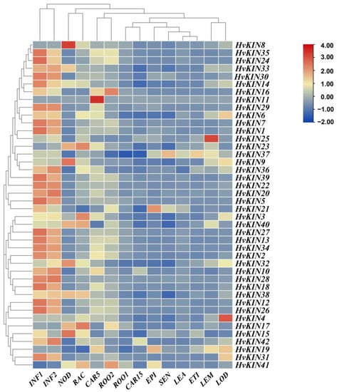Expression profiles of a subset of HvKINs. A graduated color scale from blue to red is used to denote the transcript levels. Expression data were retrieved from IPK (https://apex.ipk-gatersleben.de/apex/f?p=284:10 accessed on 22 January 2022). The subset of HvKIN genes’ hierarchical clustering and normalized expression levels were both adjusted using logarithmic functions. The heatmap was produced using the TBtools software. INF1: Young developing inflorescences (5 mm); INF2: Developing inflorescences (1–1.5 cm); NOD: Developing tillers, 3rd internode (42 DAP); RAC: Inflorescences, rachis (35 DAP); CAR5: Developing grain (5 DAP); ROO2: Roots (28 DAP); ROO1: Roots from seedlings (10 cm shoot stage); CAR15: Developing grain (15 DAP); EPI: Epidermal strips (28 DAP); SEN: Senescing leaves (56 DAP); LEA: Shoots from seedlings (10 cm shoot stage); ETI: Etiolated seedling, dark cond. (10 DAP); LEM: Inflorescences, lemma (42 DAP); LOD: Inflorescences, lodicule (42 DAP).
