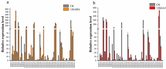 Gene expression analysis of HvKINs after ABA and GA3 treatment. The data summarized at least three biological replicates. (a) HvKINs gene relative expression in barley after 12 h of ABA treatment. Orange represents the ABA therapy group, while gray represents the control group. (b) Relative expression of HvKINs genes in barley following a 12-h GA3 treatment. Red represents the GA3 treatment group and gray served as the control group.