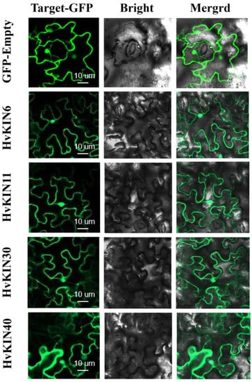 The subcellular localization of selected HvKIN proteins (HvKIN6, HvKIN11, HvKIN30 and HvKIN40) were analyzed to assess the possible differences between KvKIN proteins in the barley. We used the heterologous expression of HvKINs fusion proteins in tobacco to analyze their subcellular localization. HvKIN6, HvKIN11, HvKIN30, and HvKIN40 are mainly localized to the cell membrane and nucleus and may be associated with material transport and cell division in plant cells (Figure 12).