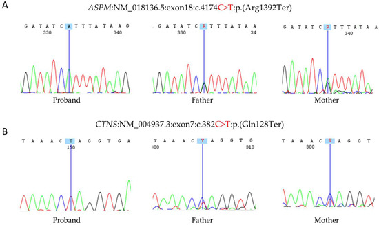 Sequence electropherograms of the trio for both variants. (A) c.4174C>T in the ASPM gene in homozygous state in the patient and heterozygous state in her parents. (B) c.382C>T in the CTNS gene in homozygous state in the patient and heterozygous state in her parents.