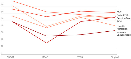 One of the interesting findings we attempted in our study was to identify gene datasets that are significantly enriched from machine learning heuristics. We observe that there is a significant amount of attribute fitting with instances taken up from all datasets. While all instances were used and compared across all algorithms to further gain insight into this, the accuracies were tabulated accordingly (Figure 2; Supplementary Table S1). For PIK3CA, experiment (i) accuracy varies between 78% (decision tree) and 48% (Naïve Bayes). For experiment (ii), accuracy varies between 67% (MLP) and 41% (Naïve Bayes). For experiment (iii), accuracy varies between 77% (decision tree) and 44% (Naïve Bayes). On the other hand, for KRAS, experiment (i) accuracy varies between 62% (decision tree) and 27% (K Means). For experiment (ii), accuracy varies between 62% (decision tree) and 17% (Naïve Bayes). For experiment (iii), accuracy varies between 53% (decision tree) and 18% (Naïve Bayes). Whereas TP53 showed variable changes, for experiment (i) accuracy varies between 61% (MLP) and 35% (K Means). For experiment (ii), accuracy varies between 56% (SVM, MLP and decision tree) and 35% (K Means). For experiment (iii), accuracy varies between 55% (MLP) and 8% (Naïve Bayes). For experiment (iv), accuracy varies between 57% (MLP) and 34% (K Means). Additionally, for experiment (v), accuracy varies between 50% (decision tree) and 21% (K Means). For experiment (vi), accuracy varies between 51% (decision tree, logistic regression, MLP, SVM) and 35% (K Means). For gingival datasets, experiment (i), accuracy varies between 63% (MLP) and 29% (K Means); for experiment (ii), accuracy varies between 49% (MLP) and 29% (K Means); for experiment (iii), accuracy varies between 63% (decision tree) and 29% (K Means); for experiment (iv), accuracy varies between 54% (MLP) and 29% (K Means); for experiment (v), accuracy varies between 52% (MLP) and 29% (K Means); and for experiment (vi), accuracy varies between 40% (decision tree, logistic regression, MLP, SVM) and 30% (K Means clustering). From the above results, it is evident that only experiment (i) is shown to have the highest accuracy when compared with other experiments from (ii) to (vi) (Table 1). We present accuracies with 5-fold cross-validation using different algorithms on the 4 genes in Table 2.