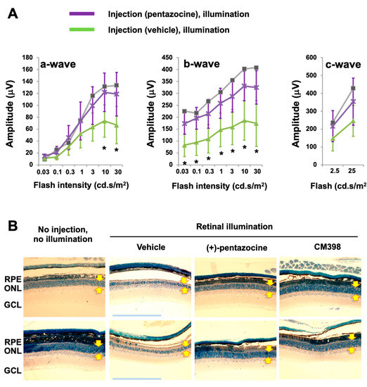In this study, we chose (+)-pentazocine for S1R modulation for two main reasons: (1) it is well-established as a high-affinity (6.7 nM), high-selectivity S1R ligand (>200 fold over S2R) [6] and (2) it has been repeatedly shown to be photoreceptor-protective in RP and diabetic retinopathy models [21,22,23,24] but has not been tested in an AMD-related model in vivo [16]. We thus used (+)-pentazocine to eliminate the choice of S1R modulator as an experimental variable. Moreover, this established S1R agonist appeared to be ideal as a “model drug” for us to validate our experimental setting of retinal illumination in Abca4−/−Rdh8−/− mice related to AMD pathology. We performed a single, one-time i.p. injection of (+)-pentazocine (1 mg/kg) in Abca4−/−Rdh8−/− mice 30 min before retinal illumination (10,000 lux for 30 min), and recorded ERGs 7 days later. While a-waves reflect phototransduction responses in rod photoreceptors, b-waves reflect the activities of inner retinal neurons, especially bipolar cells but are strongly influenced by photoreceptor function, and c-waves are often used to monitor the function of the RPE [29]. As indicated in Figure 1, in the mice treated with (+)-pentazocine compared to the vehicle control group, the a-wave amplitude increased at the light intensities of 10 and 30 cd·s/m2 and the b-wave amplitude increased at all light intensities. The c-wave showed a trend of improvement, albeit without reaching statistical significance. This result was also reflected in the stained retinal sections where the thinning of the outer nuclear layer (ONL) due to retinal illumination appeared to be partially rescued by pretreatment of the mice with (+)-pentazocine (Figure 1B).