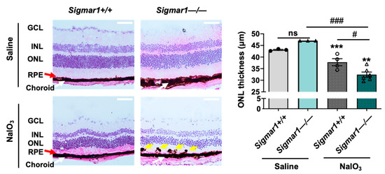 Comparison of photoreceptor loss in NaIO3-challenged Sigmar1+/+ and Sigmar1−/− mice. Mice received saline (PBS) or 30 mg/kg NaIO3 through tail-vein injection. Eyeballs were collected 3 days after injection, and fixed retinal sections were H&E stained. RPE: retinal pigment epithelium. ONL/INL: outer/inner nuclear layer. GCL: ganglion cell layer. Red arrow marks the RPE layer. Yellow arrow points to pigmented blebs in the RPE layer. Scale bar: 50 μm. Quantification: Data are presented as mean ± SEM. In the NaIO3-treated group, n = 4 Sigmar1+/+ mice (8 eyes) or n = 6 Sigmar1−/− mice (12 eyes); in the saline-treated group, n = 3 Sigmar1+/+ mice (6 eyes) or 3 Sigmar1−/− mice (6 eyes). Statistics: one-way ANOVA and Tukey test; # p < 0.05, ### p < 0.001; ns, not significant. ** p < 0.01, *** p < 0.001, compared to the first bar.