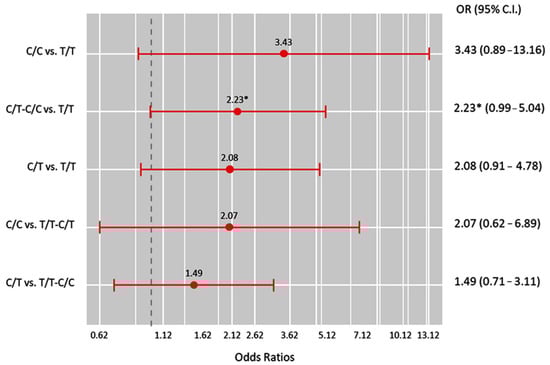 Genetic association models for propensity-matched cohorts (each = 71). OR (95% C.I.): odds ratio (95% confidence interval). * p-value < 0.05.