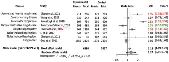 In an attempt to reach an evidence-based conclusion, the authors reviewed the study variant-related publications from which genotype count in cases and controls could be obtained (Table S1). Eight articles on different human diseases [,,,,,,,] with complete genetic data were enrolled. Our meta-analysis using the random effects model revealed that patients with the rs2763979*C allele were more likely to develop paranoid schizophrenia (OR = 2.82, 95%CI = 2.26–3.52), age-related hearing impairment (OR = 1.95, 95%CI = 1.36–2.78), and diabetic nephropathy (OR = 1.38, 95%CI = 1.13–1.69). In contrast, the C variant conferred protection against chronic obstructive lung disease (OR = 0.74, 95%CI = 0.57–0.97) (Figure 3). Such contradictions (risky vs. protective phenotype) in the previous studies could be explained by (1) the acknowledged genetic heterogeneity among different study populations, (2) the differences in environmental factors and geographical distribution, (3) variation in the sample size and study methodology, and (4) the underlying effects which the genetic variants induce in “a cell-type-specific and context-dependent manner” [,].