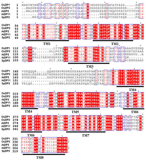 3.3. Phylogenetic Analyses and Sequence Alignment of SpZIP2 with Other ZIP Members