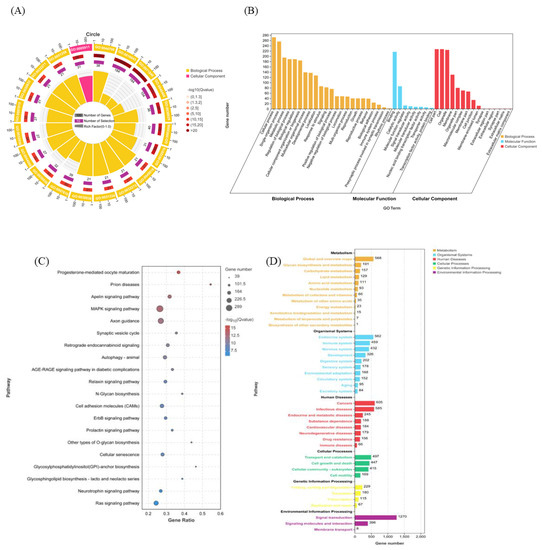 GO functional enrichment analysis was performed on the 8649 target genes predicted for ssc-miR-141; the results are shown in Figure 3A,B. The target genes of ssc-miR-141 were significantly enriched in immune system process (GO:0002376), metabolic process (GO:0008152), biological regulation (GO:0065007), cellular process (GO:0009987), and other entries at the biological process (BP). These target genes were significantly enriched in molecular functions (MF) such as binding (GO:0005488). At the cellular component (CC) level, the target genes were significantly enriched in cell part (GO:0044464), organelle (GO:0043226), etc. Following the GO functional annotation, we performed KEGG pathway enrichment analysis for the predicted target genes. The target genes of ssc-miR-141 were significantly enriched in mitogen-activated protein kinase (MAPK) signaling pathway (ko04010), autophagy-animal (ko04140), cell adhesion molecules (CAMs) (ko04514), and Ras signaling pathway (ko04014) (Figure 3C,D).