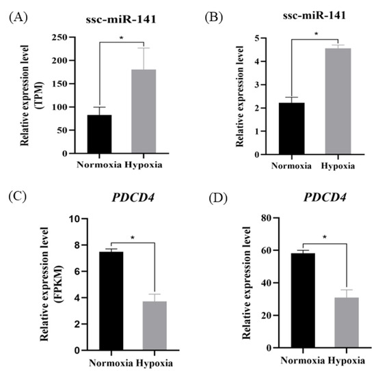 Expression of ssc-miR-141 and PDCD4 in normoxia and hypoxia groups (ATII cells). (A,C) indicates the expression of ssc-miR-141, PDCD4 RNA-seq in normoxia/hypoxia; (B,D) indicates the expression of ssc-miR-141, PDCD4 RT-qPCR in normoxia/hypoxia. * indicates p < 0.05.