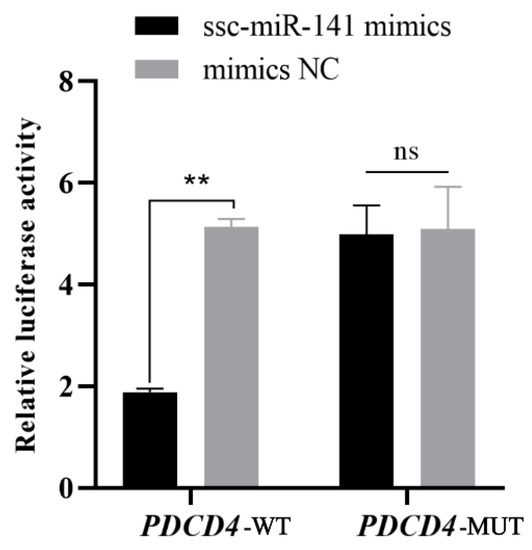 A dual-luciferase activity assay was performed using 293T cells to verify whether ssc-miR-141 binds to the 3′-UTR of PDCD4. The luciferase activity was significantly inhibited in the group transfected with ssc-miR-141 mimics + PDCD4 WT (p < 0.01) but not in the group co-transfected with ssc-miR-141 + PDCD4 MUT (p > 0.05) (Figure 5). These results suggest that ssc-miR-141 mimics are involved in the regulation of PDCD4 expression by binding to the predetermined binding site in the 3′-UTR.