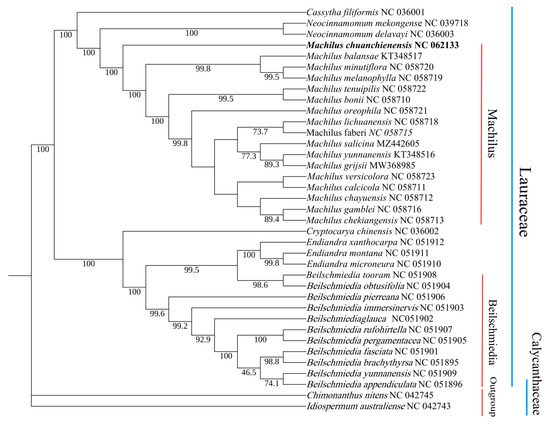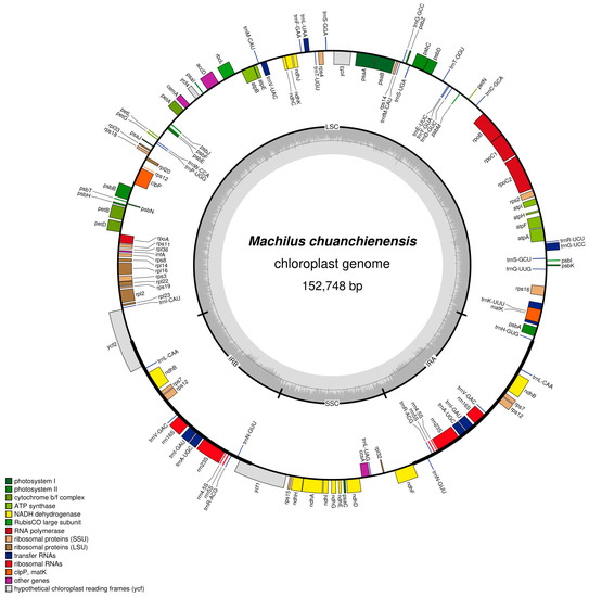 As important plastids in plant cells, chloroplasts are involved in the main functions, including photosynthesis [13], carbon sequestration, starch storage, nitrogen metabolism, fatty acids, and nucleic acid synthesis [14]. In addition, they self-replicate organelles with their DNA and RNA and have relatively independent genetic replication mechanisms like mitochondria [15]. Although the structure of the cp genome is remarkably conserved [16], its size and gene content have polymorphism related to genes reorganization and IRs region growth and contraction [17], which has been used for molecular identification, population genetics, endangered species conservation, and phylogenetic analysis [18,19]. High-throughput technologies’ successful development has made the sequencing of chloroplast genomes economical and efficient, significantly developing chloroplast-based related studies. One of the most valuable methods at the moment is building a phylogenetic tree of the Lauraceae utilizing the cp genomes, provided that the technology for sequencing and assembling nuclear and mitochondrial genomes of Lauraceae is not to be universal [20]. However, using whole genome sequencing (WGS) technologies to research M. chuanchienensis’ genome has yet to be reported, and its taxonomic position within Lauraceae has not been precisely placed.