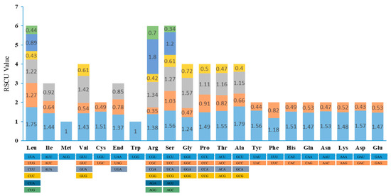 The M. chuanchienensis cp genome had 23,598 codons in its all protein-coding genes. (Table S3). Among these codons, the three most numerous amino acids were leucine (2396, 10.15%), isoleucine (2003, 8.49%), and serine (1847, 7.83%), while the three least numerous amino acids were cysteine (272, 1.15%), tryptophan (405, 1.72%), and methionine (557, 2.36%). Based on the calculation of relative synonymous codon use (RSCU), 31 codons with an A or T ending had RSCU >1 except TTG (Leucine, 1.27) and TCC (Serine, 1.03), and 31 codons had RSCU < 1, the vast majority of which ended in C or G, with only CTA (Leucine, 0.89) and ATA (Isoleucine, 0.92) ending in A. In addition, ATG and TGG had no codon bias (RSCU = 1) (Figure 3).