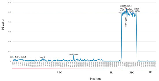 To examine levels of sequence divergence of the M. balansae, M. grijsii, M. robusta, M. chuanchienensis, and M. yunnanensis, we calculated the values of nucleotide variability (Pi). The Pi values within 500 bp among the five genomes vary from 0 to 0.1618 with a mean of 0.0176. In addition, we identified seven hypervariable loci (Pi > 0.15), which are ndhH-ndhA (0.1618), ndhF (0.1564), ndhA (0.1554, 0.1525) ycf1 (0.1545, 0.1502), rps15 (0.1543), rps15-ndhH (0.1511), psaC-ndhD (0.1504). They are all in the SSC region (Figure 6), indicating that the SSC regions were much more divergent than IR and LSC regions and that the IR regions were highly conserved, consistent with the above analysis.