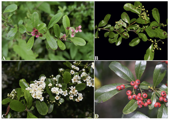 - Wang, L.R. Red flower phenotype of Chinese firethorn was found in western Hubei. Life World 1987, 4, 2. (In Chinese) [Google Scholar]