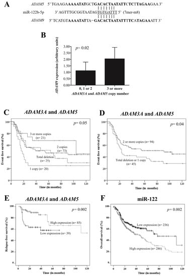 Potential pseudogene-microRNA(miRNA)-mRNA interaction and head-and-neck squamous cell carcinoma (HNSCC) prognosis. (A) Predicted miRNA miR-122b-5p binding site at ADAM5 pseudogene-derived transcript and at ADAM9 3′-unstranslated region (7mer-m8 site). The miRNA “seed” region is presented in underlined font. The homologous sequence between ADAM5 and ADAM9 is represented in bold letters. (B) ADAM3A and ADAM5 pseudogenes copy number variation and ADAM9 expression in oropharyngeal squamous cell carcinoma (OPSCC) patients. The mean mRNA expression level was higher in OPSCC patients with copy number gain of the ADAM3A and ADAM5 pseudogenes (n = 5) (2.04 arbitrary units (AUs) ± standard deviation (SD): 0.89) than carriers of total deletion, one, or two copies (n = 21) (1.12 AUs ± SD: 0.67, p = 0.02). (C,D) Probability of event-free survival (EFS) of 139 OPSCC patients stratified by ADAM3A and ADAM5 copy number variation. (C) The Kaplan–Meier curve suggests that CNVs status seems to have an association with EFS (p = 0.05). (D) The Kaplan–Meier curve indicates lower EFS in patients with total deletion or one copy of ADAM3A and ADAM5 pseudogenes (19.1% vs. 50.7%, p = 0.04) when compared with carriers of two or more copies. (E,F) Prognostic value of ADAM3A and ADAM5, and miR-122 in 124 and 522 HNSCC patients, respectively, according to the Kaplan–Meier Plotter online database. (E) Lower expression of pseudogenes ADAM3A and ADAM5 indicated lower relapse-free survival (RFS) in HNSCC patients. (F) Although RFS data was not available for miRNAs, higher expression of miR-122b-5p was associated with lower overall survival in HNSCC patients.
