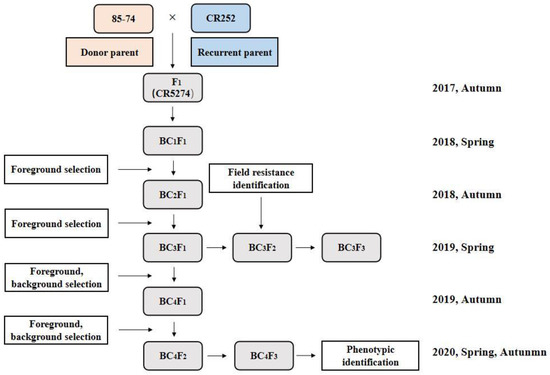 Schematic diagram of marker-assisted gene pyramiding. CR252: recurrent parent; 85-74: donor parent.