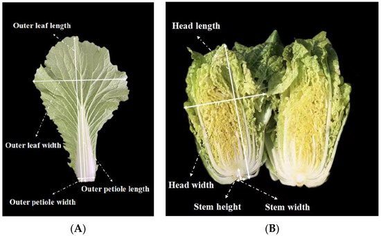 (A) The measurement standard of outer-leaf length, outer-leaf width, outer-petiole length, and outer-petiole width. (B) The measurement standard of head length, head width, Stem height, and Stem width.