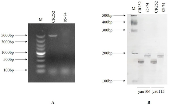 Screening results for polymorphic markers for foreground selection. (A) polymorphism of CRa full-length marker between CR252 and 85–74. (B) polymorphism of CRd linked markers yau106 and yau115 between CR252 and 85–74, respectively.