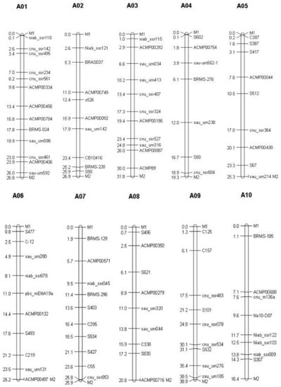 A total of 1200 genomic SSR markers designed based on the B. rapa genome sequence [32,33] were used for polymorphism screening between two parental lines. Finally, 95 polymorphic markers evenly distributed on 10 chromosomes were selected for background screening from the BC3F1 generation, of which the numbers of markers on chromosomes A1 to A10 were 13, 9, 11, 7, 9, 10, 10, 9, 9, and 8. The total physical length covered was 205.7 Mb. The average interval of markers was 2.6 Mb (Table S2), and the distribution of these markers in the linkage groups is presented in Figure 4.