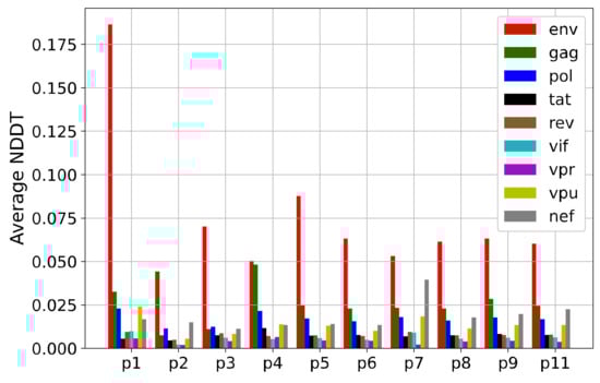 In addition, we extract the eight sequence segments of all sequences in dataset 1, calculate the average NDDT of the eight sequence segments for each patient during the whole sampling time period, and analyze the distribution and frequency of the mutation, as shown in Figures S21–S30. In the whole infection stage, gp41 sequences of most patients show the highest mutation rate; Nef, Vpu, RT, p17 and p24 also show relatively higher average mutation rate, while Vpr and Tat show lower average mutation rate.