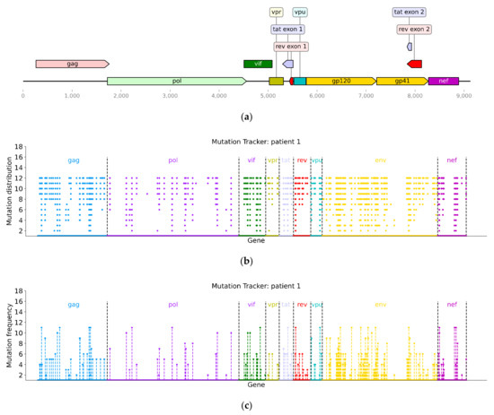 (a) Structure of the RNA genome of HIV-1. The structure is drawn through the DNA viewer (https://pypi.org/project/dna-features-viewer/, accessed on 17 April 2021); (b) Single nucleotide mutation distributions of sequences at 12 time points. The horizontal axis represents the gene position, and the vertical axis represents the mutations of the mutant sequence compared with the reference sequence (the sequence at the first time point). For example, the scale “1” means the sequence at the first time point, and the scale “2” means the sequence at the second time point; the scale “12” means the sequence at the 12th time point; (c) Single nucleotide mutation frequencies of sequences at 12 time points. The horizontal axis represents the gene position, and the vertical axis represents the number of sequences mutated at the corresponding gene site. The sequence at the first time point is regarded as the reference sequence, and the mutation profiles of all genes are assembled without considering the noncoding region.